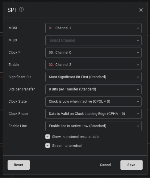 I downloaded Saleae’s Logic 2 analyzer and created a SPI analyzer with these configurations: