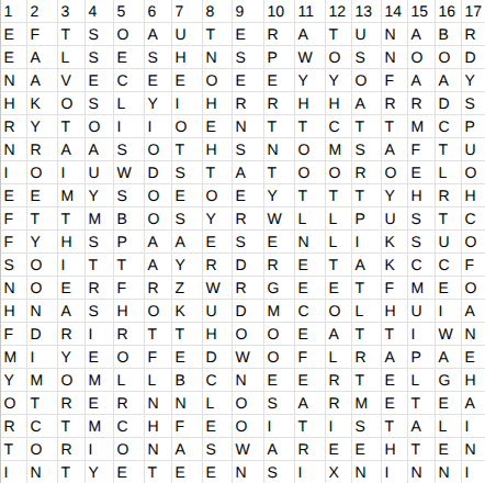 At first, I thought that this might be some sort of word search puzzle after finding the word “orion”, but I scrapped that idea after discovering no other relevant words. I decided to use the hint, which hinted to the amount of letters in the ciphertext. The grid had 340 letters, which I realized was one of the versions of the Zodiac killer cipher I saw earlier on Dcode. After doing more research into the cipher I found that the second zodiac killer cipher was a real encoded message consisting of both a transposition and a homophonic cipher in a 17x20 grid of symbols. My grid was already decoded into letters so I figured that only the transposition part would be applied. Dcode helpfully provided a transposition grid for the cipher.