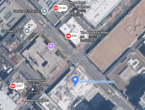 I quickly located the San Francisco Chronicle on Google Maps and searched for nearby hotels.